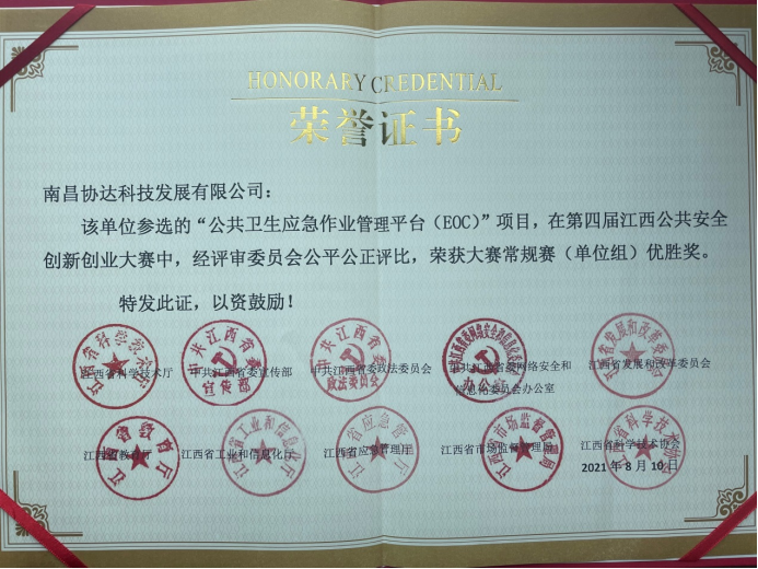 近期,我公司自主研發(fā)且擁有獨立知識產(chǎn)權(quán)的《公共衛(wèi)生應(yīng)急作業(yè)管理平臺.EOC》軟件平臺在第四屆江西公共安全創(chuàng)新創(chuàng)業(yè)大賽傳出捷報,榮獲“第四屆江西公共安全創(chuàng)新創(chuàng)業(yè)大賽”優(yōu)勝獎。